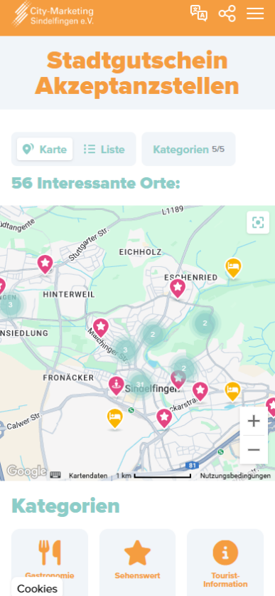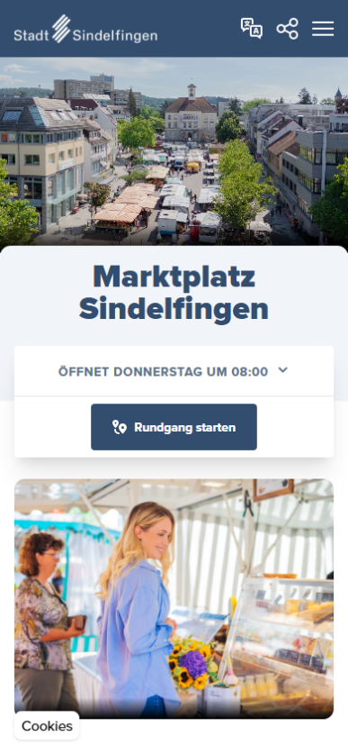 At the guide level, backend users can now access the additional ‘Design’ tab. Here, the font, colours and logos can be customised. This allows different corporate identities to be taken into account. An example shows the city of Sindelfingen with guides to: restaurants, weekly markets, accommodation and city voucher acceptance points.